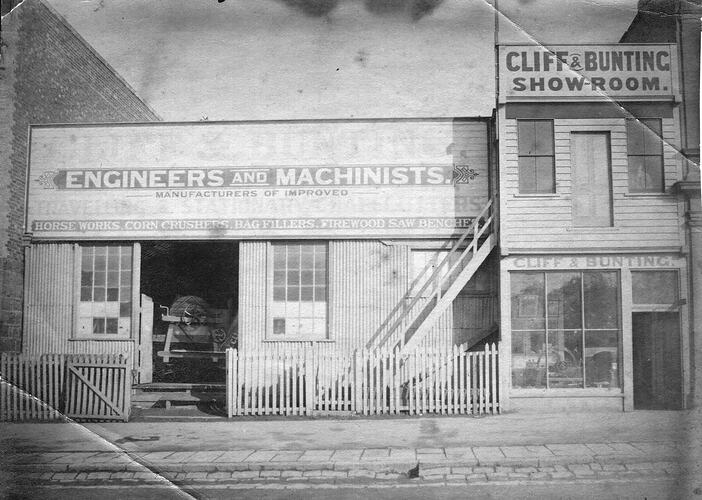 Their first manufacturing works were situated at 159 Elizabeth Street, North Melbourne, on the west side between Victoria Street and Flemington Road, in an area where a concentration of agricultural implement and machinery manufacturers had emerged from the 1860s - set amidst related businesses such as coachbuilders, saddlers and tentmakers. In 1895, Cliff & Bunting acquired the plant, stock & good-will of one of their main competitors, John Swan & Co., who had been forced into liquidation by the recession and agricultural downturn of the early 1890s. Swan & Co was established in 1866 and by the late 1880s had developed a strong reputation as one of Victoria's two leading chaffcutter manufacturers. By the 1890s Swan & Co had diversified into a range of other agricultural machinery, including reaping machines, strippers and winnowers. Cliff & Bunting relocated their business to Swan & Co's larger premises in Blackwood Street, North Melbourne, and for a number of years continued to offer spare parts for former Swan & Co products. [4]