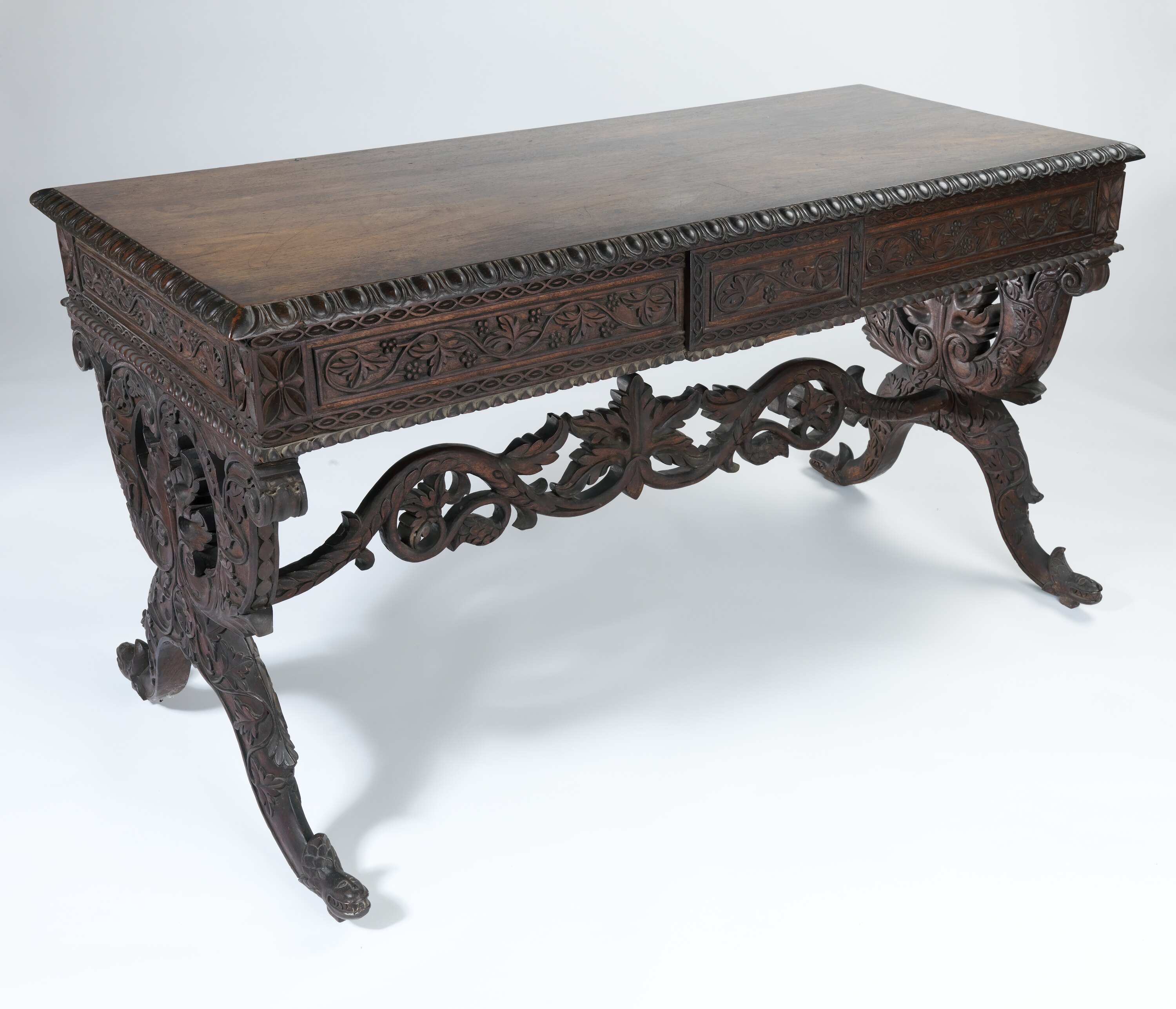 Among the items specifically listed in the inventory of the Twycross family home, Emmarine, at the time of John Twycross' death in 1889, is this 'carved Indian table'. It was situated in the Drawing Room, acting as a shelf for a pair of Japanese vases, two nautilus shells, a Japanese tea set, a sandalwood box and three lacquers. In the twentieth century, the table followed the family to their new home, an Edwardian weatherboard house in Elsternwick (also named Emmarine) where it sat in the bay window of the Drawing Room.