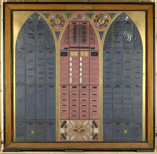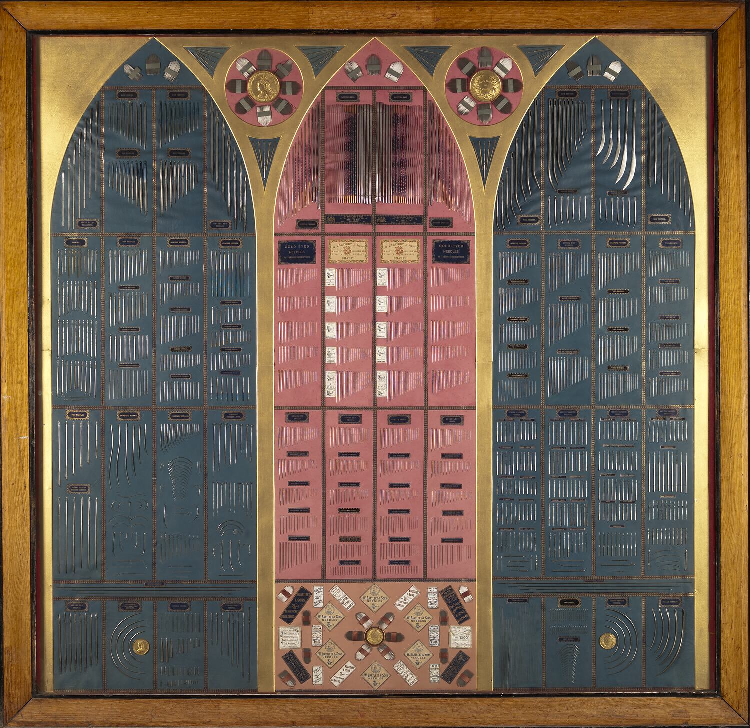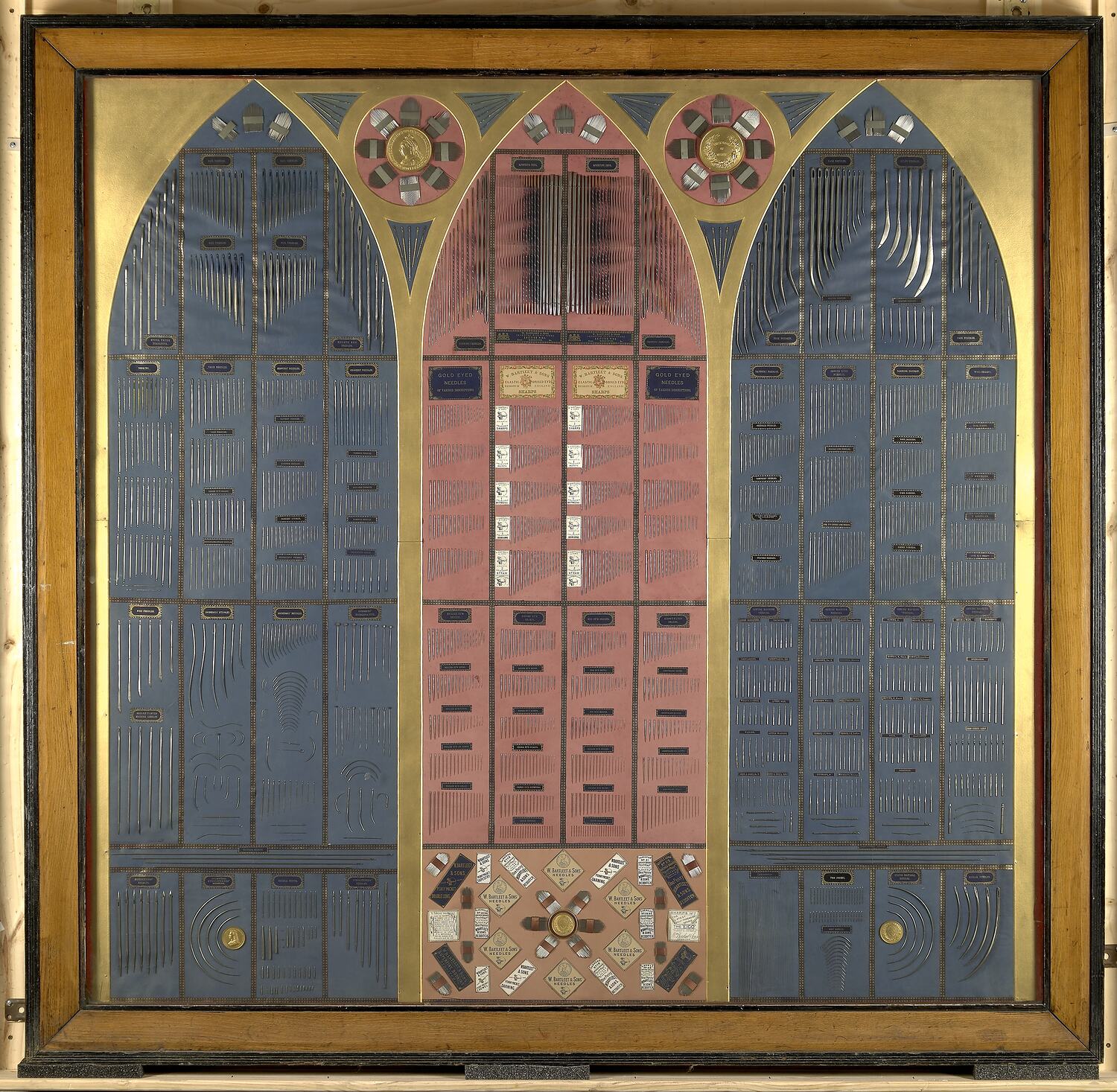 This magnificent display is emblematic of the power and wealth of the 19th century needle manufacturing empire. The ecclesiastical and armorial mode of display chosen by Bartleet and Sons, transforms the simple needle into a mighty sword of manufacturing domination. Created to be exhibited at the world trade fairs of the 1880s, including the Adelaide Jubilee (1887) and the Melbourne Centennial International Exhibition (1888) the display is like a pennant to be carried proudly into battle, offering a pointed challenge to rival needle manufacturers, and is representative of the might and main of the British Empire.