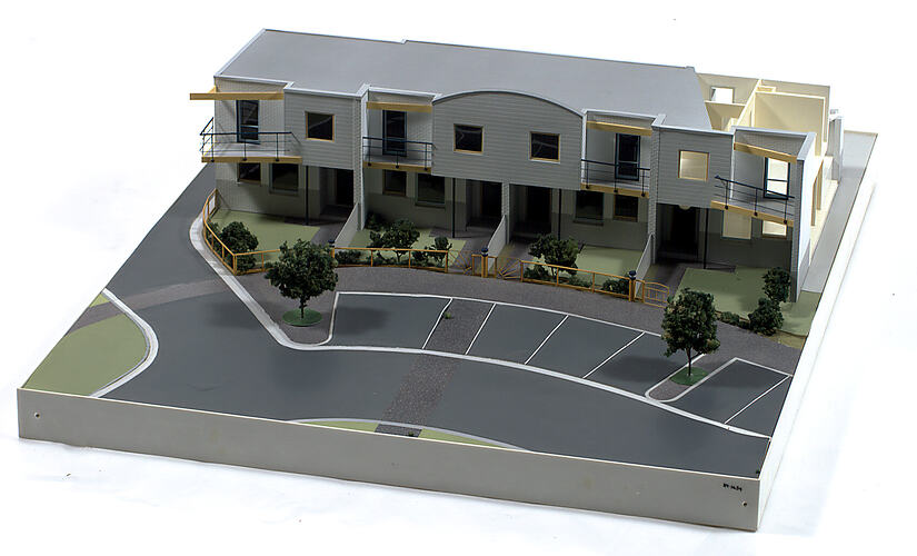 The large townhouse development at Bay Street, Port Melbourne, was the result of an external consultant being asked to design low-income housing for the State Government department, the Ministry of Housing. Porthole windows, ship's railing, grey stucco and white bricks allude to its seaside location. Front fences and gardens, individual front doors and private balconies signify territoriality. From Bay Street, there is a formal gateway to this enclave of homes. In the centre of the scheme is a public garden space. This scheme, and others by private consultants at Highett, Malvern and another at Port Melbourne, were indicative of the enlightened approach by the Ministry of Housing in the 1980s to provide quality medium-density housing in Victoria.
