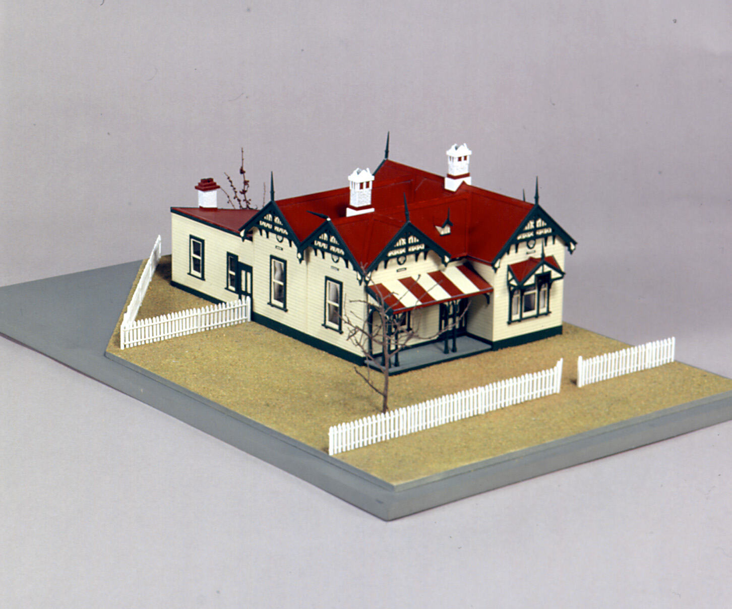 Built for the local policeman at Dromana, this three bedroom weather board house, with its corrugated iron roof and ornate timber gable-ends, is a typical example of a dwelling provided by the Government for its employees in the late nineteenth century. Each room off the central hallway had its own fireplace. At the back of the house, the rear verandah provided access to the policeman's office and the pantry and kitchen where there was another fireplace, this one for cooking. The stable and lock-up were separate buildings behind the house in an area enclosed by a timber paling fence. This house design was repeated at Whittlesea, once again to house the local policeman and his family.