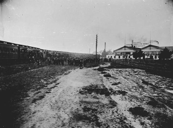 The Sunshine Harvester Works invited guests to inspect the factory and machinery manufactured on site. One of the first inspections organised of the site was a farmers' tour in 1907. While attending the Royal Melbourne Show, over 600 farmers visited the Sunshine Harvester Works. A special train transported farmers from Spencer Street Station to the factory. Staff acted as guides for the farmers who were shown around the site, viewed agricultural equipment and given explanations about the different stages of manufacturing. The session ended with refreshments and speeches. The company held similar tours over the coming decades which attracted hundreds of farmers.