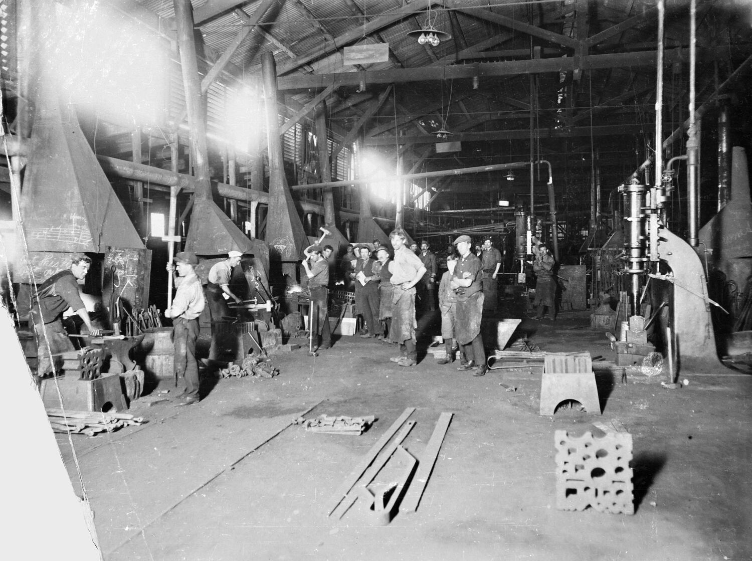 The Blacksmiths' Shop was one of the Sunshine Harvester Works' oldest departments. It produced forged parts for various items including cultivator tynes, plough shares and beams, tyne-points, links and formed bars. The factory's front gate (located at Russell Street) were manufactured in this department by Charlie Pippett in 1922.