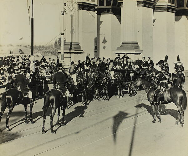 The Commonwealth of Australia was inaugurated on 1st January 1901 in Centennial Park, Sydney. In March, elections were held for the new Federal Parliament, and in May the celebrations focused on Melbourne, where the first Federal Parliament was opened in the (Royal) Exhibition Building. This narrative describes the street parades and public celebrations held during Federation festivities in Melbourne.