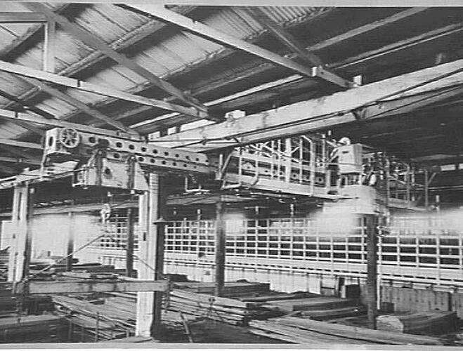 The Sunshine Harvester Works' iron yard housed steel used by the company to produce agricultural equipment. The iron yard covered three bays on the factory site. Many shapes, sizes and grades of steel were used to manufacture equipment. During peak manufacturing periods, the iron yard contained up to 10,000 tons of steel bars and plates. The storage facility was serviced by an overhead crane which traversed the whole area. The crane also went down to the factory railway line which delivered steel into the site. Steel came from the BHP steel mill. Some steel orders were placed up to 12 months in advance of delivery to meet the Sunshine Harvester Works' projected production schedules.