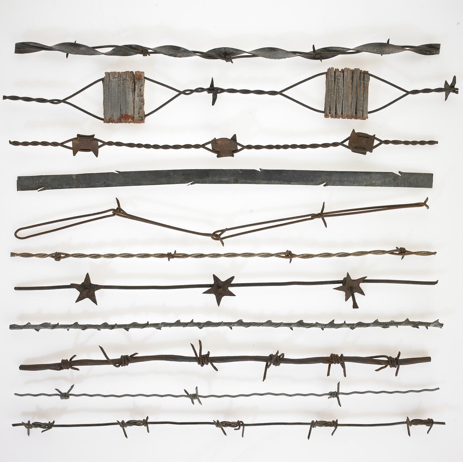 . Samples of Australian-designed & made barbed wires, including J.C. Perry's welded-pin single-strand barbed wire (1897), H.A. Abbott, single-strand 4-point military entanglement wire (1939) & the Australian 4-point spiral barbed wire.