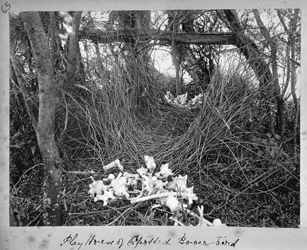 'This bird makes for the fruit when it ripens in the garden, especially the figs. The scrub, where it comes from, grows on a sandy bottom in the neighbourhood of the station. In this scrub I several times espied the bower of the bird, not like the edifice of the Satin Bird, which is closed on the top, but open. A cartful of bones* - the vertebrae of sheep predominating - pieces of glass, unripe wild fruit, even a shilling, sometimes betray the entrance of the bower.