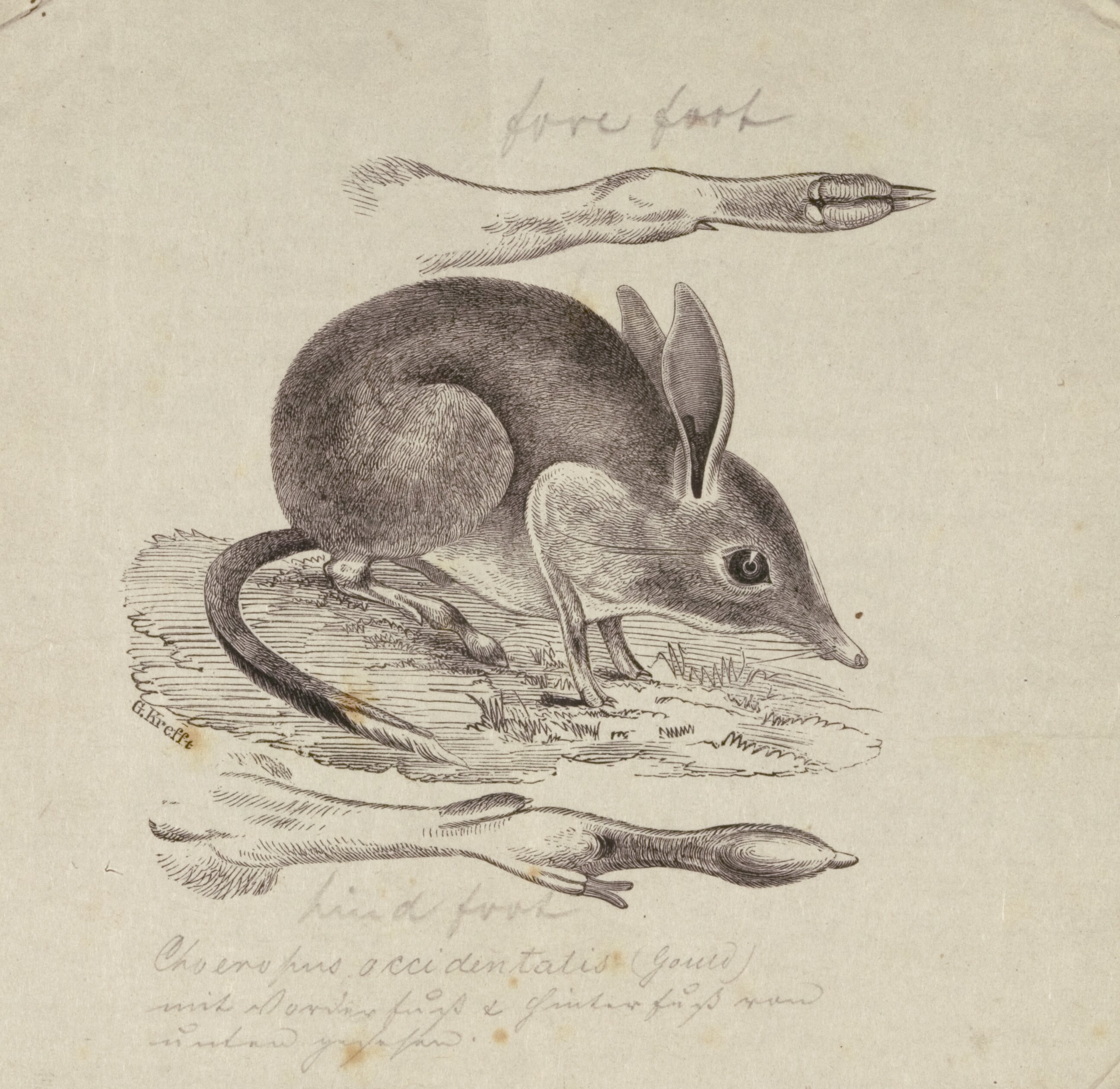 Following the break-up of the expedition in December 1857, and eventual lodgement of the collections at the museum, McCoy employed Krefft for four weeks in February 1858 to sort out the 750 mammal specimens and 29 mammal species taken in the previous year, and organise the best set of specimens to be kept for the museum and organised for display. Krefft decided to keep six of the rare Chaeropus specimens, including two skeletons and four skins (which were stuffed and mounted at the same time, with the taxidermy attributed to George Fulker, the museum taxidermist from 1854-1858).
