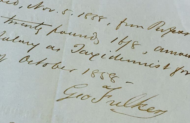 George Fulker was born in London, England, about1805/1806. During the 1830s, Fulker lived in Marylebone, London, where he was a boot- and shoe-maker, and where he married Christiana in 1833. Seeking to escape the economic depression in London during this period, George and Christiana successfully applied to the Free Passage to South Australia migration scheme which ran from 1836-1841. They embarked from London in February 1840 on the 'Orleana' and arrived in Adelaide in June 1840. George was aged about 35 years when he arrived, and was soon running his own business as a boot-maker and bird-stuffer from a succession of shops in Hindley Street, Adelaide circa 1843-1851. George is reported to have met natural historian William Blandowski (1822-1876) while in Adelaide. George's movements from 1851-1853 are unclear, but it is likely that he packed up in Adelaide, and joined the exodus of thousands of South Australians in the rush to the Victorian goldfields.
