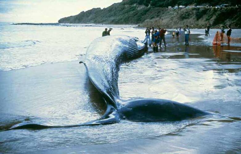 Occasionally, following a major catastrophe such as a collision with a ship, or because they are in poor health, or for other reasons that are not fully understood, Blue Whales strand or beach. Unfortunately, whales that strand on land frequently die, often from dehydration. Poor health seems to be the reason why a young male Blue Whale, 18.7 m in length, stranded and died on the beach at Cathedral Rock, near Lorne in western Victoria, in 1992.