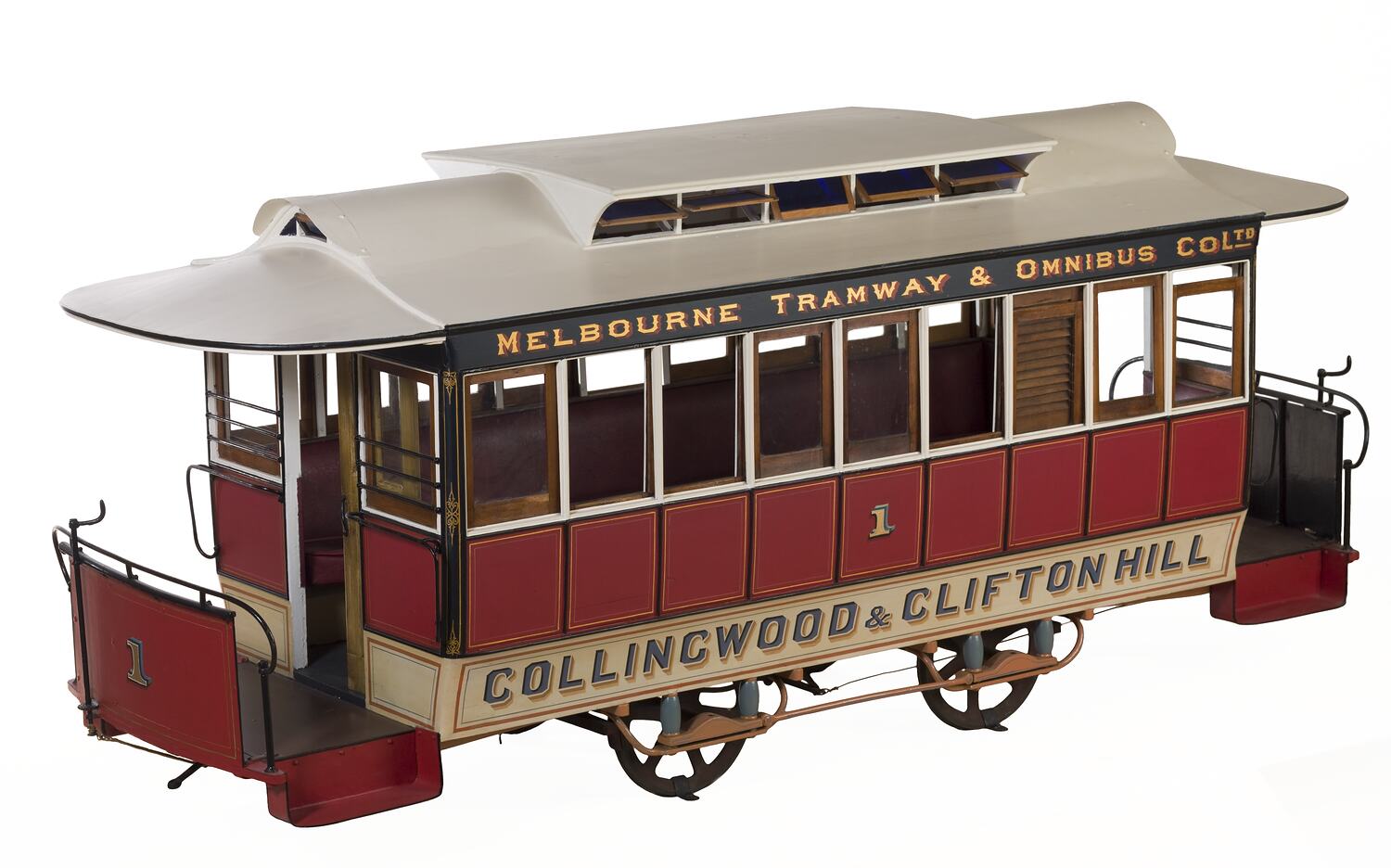 The model is painted to represent a Collingwood & Clifton Hill line tram which ran via Smith & Gertrude Streets and along the south end of Nicholson Street (then called Evelyn Street) to the city. This service first ran in August 1887.