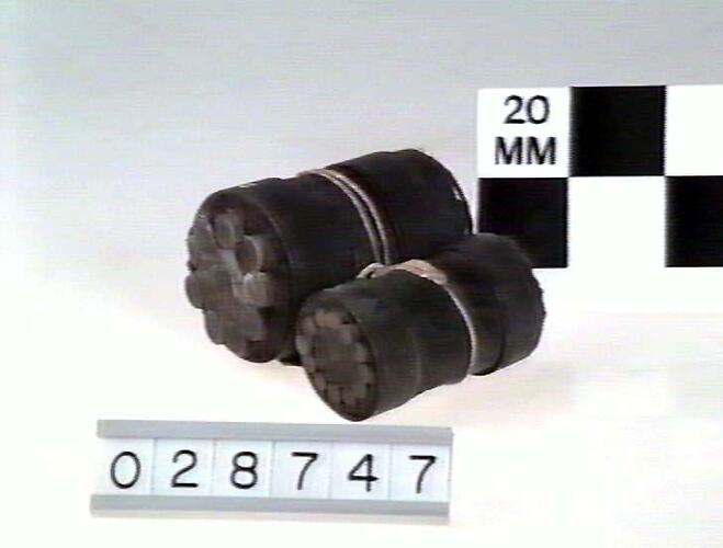 The larger of the two cable sections has a central conductor strand of 7 wires, surrounded by insulation to about 15 mm diameter, and armoured with 9 solid wires, each of about 7.2 mm diameter (No. 2 BWG). It is possible that this cable sample could be from the shore-end section of the Cabot Strait cable but no description of the latter has been located.