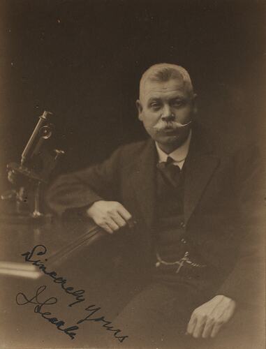 Following the re-opening of the Industrial & Technological Museum in 1915, next to the Public Library, James Searle also became a regular donor to Museum Victoria's technology collections, depositing some 125 items over the period of 22 years between 6 Apr 1916 and 22 Feb 1938. The items, mainly received singly or in small batches, perhaps reflect the ongoing process of Searle gradually cleaning out his rooms and rationalising his own collection of bits and pieces acquired during a lifetime working in the field of scientific instruments and photography. They range from horological items (including some timepieces of Searle's own design and manufacture), photographic equipment, and components of limelight apparatus, to phonographic equipment, an early Daguerreotype photograph, firearms, kerosene and incandescent lamps, candlesticks, wax matches and some early scientific equipment such as Leyden Jars, a Wimshurst electrostatic generator and Leeuwenhoek microscope.
