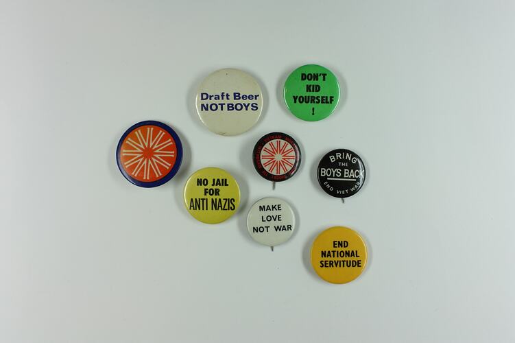 Museums Victoria Badge Collection encompasses the landmark issues of the Vietnam War period: draft resistance, opposition to imperialism, sit-ins, communism, aid appeals and peace. It is not only a set of representative objects to consider today in order to understand the sixties, it also represented a crucial cross-section of material culture at the time. Badges were one of the key ways for protestors to construct their identity and disseminate their views. Many peace activists would amass hundreds of such badges into their personal collections, like many Museums Victoria donors actually did. Wearing public signs to convey anti-war sentiment was a powerful act at a time when the 'cultural conflict [.] played out as a clash of symbols: long hair, the flag, the draft card,' to which one could presumably also add the sunburst Vietnam Moratorium symbol, the raised fist and many more.