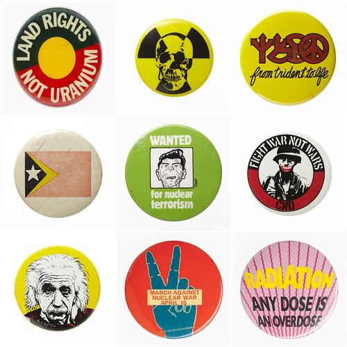 He donated 150 anti-nuclear badges for the Museums Victoria 1986 exhibition celebrating the Year of Peace, as he considered them important instances of social history. In a 2016 interview he discussed the strong relevance of badges as symbols in the seventies, noting the similarity between the use of badges at that time and the contemporary phenomenon of the meme. Some badges in the collection are actually discoloured and weathered through use in protests. Apart from producing and wearing badges, he also recalled screen printing posters and t-shirts as well as engaging in direct action activities like posting fake newspaper advertisements outside of newsagents condemning the uranium mining industry.