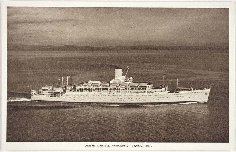 The Orcades was the first new purpose-built vessel to enter the Australian migrant trade after the Second World War. She set a new standard in style and accommodation, offering multiple saloons, shops, a hair salon, hospital, swimming pool, and a range of cabin choices.