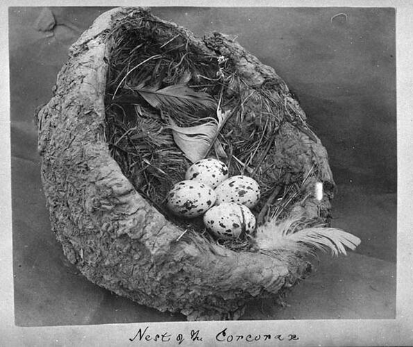 Nest - Large, bowl shaped, composed of coarse cemented mud scantily lined inside with matted stringy-bark, grass, and sometimes with fur and feathers, and conspicuously placed on any convenient horizontal limb of a tree in open forest or belt of timber. (See illustrations.) Dimensions over all of an average nest, 8 ½ inches by 6 ½ inches in depth; egg cavity 7 inches across by 3 inches deep.