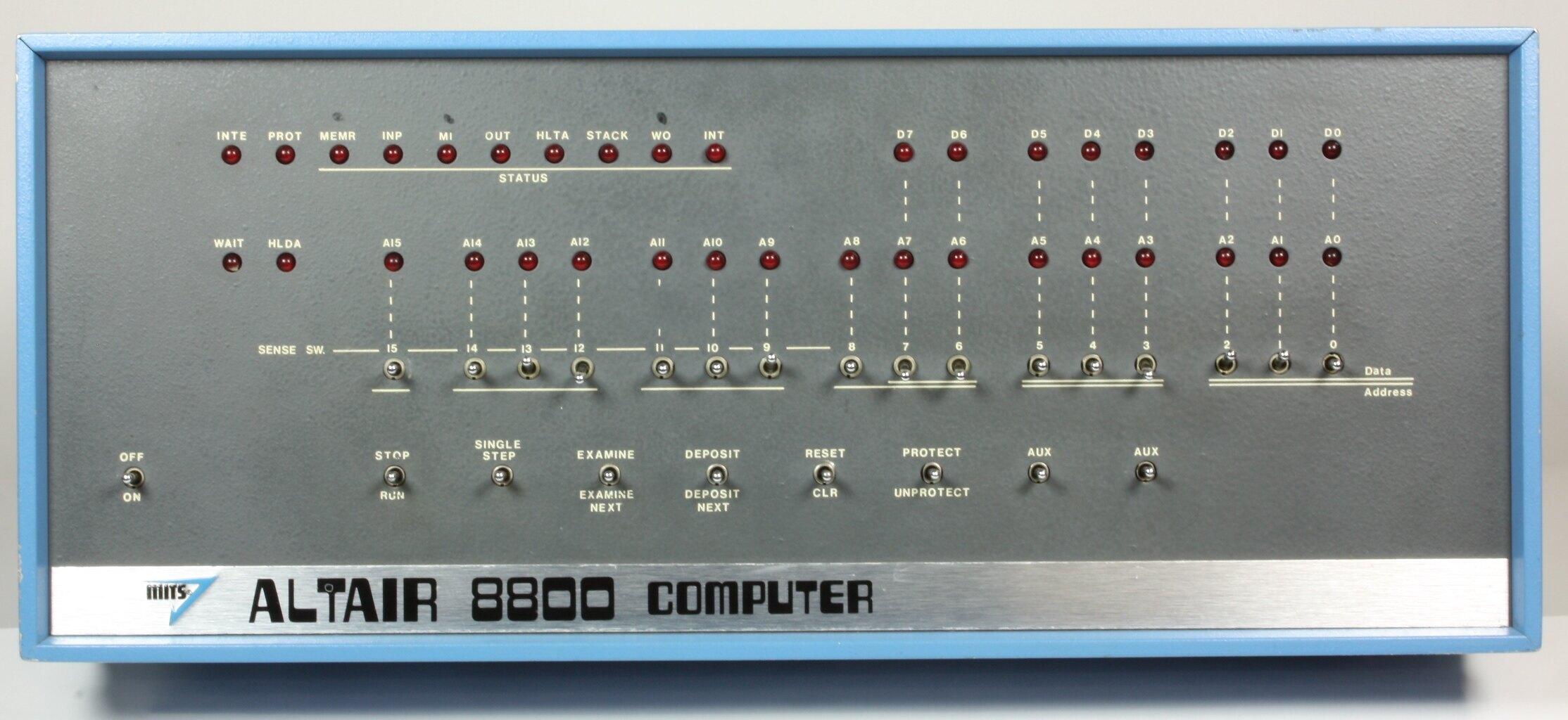 At $US 395 the Altair 8800 computer kit was relatively cheap to buy but required considerable work and skill to assemble. Once complete, the Altair 8800 looked very different to the present day desktop and laptop PCs. It came without a monitor, keyboard, disk drive or programs (software). Instead, users had to write their own programs in binary code by flipping switches on the front panel of the machine, one at a time for every binary digit. The output was read in binary on the light-emitting diodes (LEDs) on the front panel.
