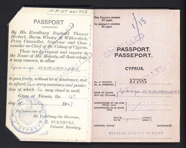 Prior to leaving Cyprus, George officially changed his name to George Kyriakides, as these were the common names that he was known under and would continue to use on arrival in Australia. George migrated to Australia at the age of 26, arriving in Melbourne on New Year's Day, 1948. He knew of other people who had migrated to Australia from his village, and had heard that it was a good place to start a new life, away from the deflated economy of Cyprus. He is listed on the passenger lists from 1949 as single, and as a 'farmer', with no mention of his skills as a silversmith.