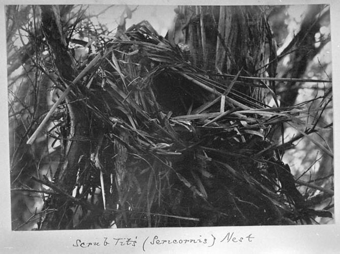 Although this Scrub Wren usually builds low, I also recollect taking a nest with eggs, ten or twelve feet from the ground, or rather above water, near the tops of some melaleuca, on Phillip Island, Western Port, and October, 1880.
