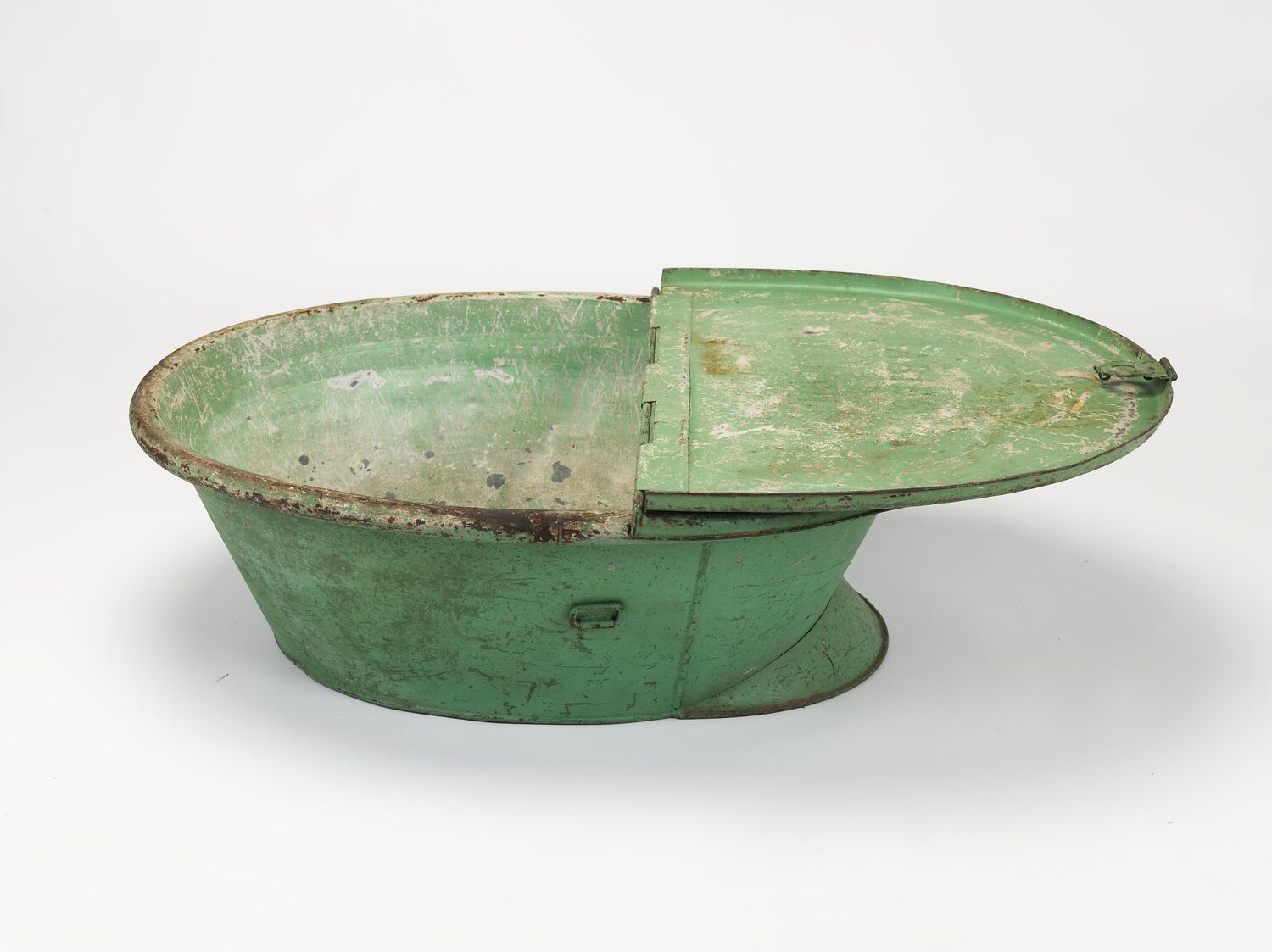 Emily Eleanor (1838-c.1929), the Davies family's middle child, told her own children and grandchildren the stories of her voyage to Australia and life in Prahran. She recalled the bath being brought out from England, and the bath's use for bathing and as a lockable storage place. She remembered bathing in the travel bath as a little girl in their Prahran home. This is an object which has passed through several generations, and the donor's family recalls the bath from around the1920s as being a functional everyday object for family bathing. According to Lawrence Wright, baths from around 1850 usually "required the exterior to be plain brown, and the interior imitation marble. The finish did not stand up very long against wear and hot water, and the repainting of the bath was, until the fairly recent introduction of porcelain enamels, a regular and seldom successful operation." This customary habit would account for the bath's current green painted surface, which is almost certainly a later addition; the donor recalls this green surface from the 1920s, and believes that frequent usage and time required the subsequent re-paint.