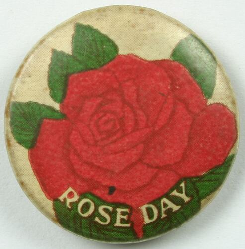 Rose Days continued to be held after World War I, such as 14 October 1921 (Sydney) and 12 April 1922 ( Melbourne). A report on the 1921 event indicated that Rose Days were now conducted by the United Charities Fund, supporting 67 charities. Museums Victoria holds an example of a Kindergarten Rose Day badge circa 1940 (NU 48087). The Australian War Memorial holds a 1946 United Charities Fund Rose Day card to identify 'Voluntary Helper' for the United Charities Fund 'Rose Day'.