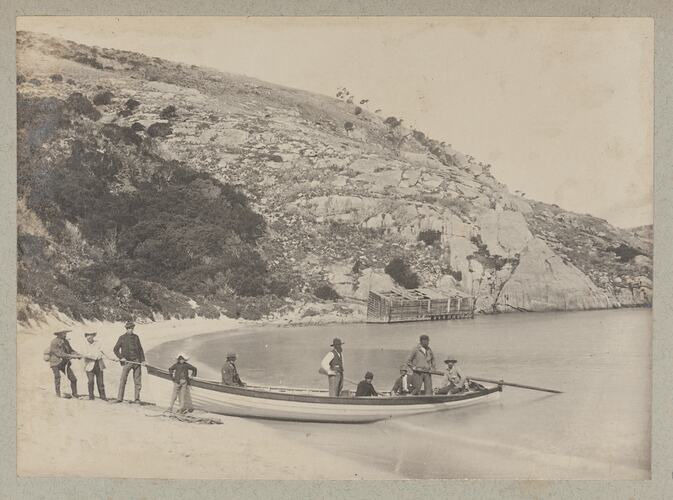 The group is now well in sight, and shortly before noon the Despatch's whistle made the high hills on either side of Murray Pass resound again. The principal lighthouse-keeper, Mr. Charles Brown, was soon off, and by his boat and with the assistance of the steamer's, the party were safely landed in the little securely sheltered East Cove, after a most favourable run down. Leaving our baggage, &c., upon the beach, a slight ascent brought us to the lower light quarters (those of the principal light-keeper), nestling amongst she-oaks, where the sward was prettily decorated with wild white daisies. We elected to pitch our camp about a mile from the quarters on Swampy Creek, close to Garden Cove, the site being well sheltered, firstly by ti-tree and other scrub, then by surrounding hills, one of which overshadowed our camp at an altitude of nearly 500ft., while running water and firewood were in abundance. A team of 12 fat and sleek bullocks was then brought into requisition to remove our tents and luggage from the beach to the camping spot. By sundown everything was in camp trim.
