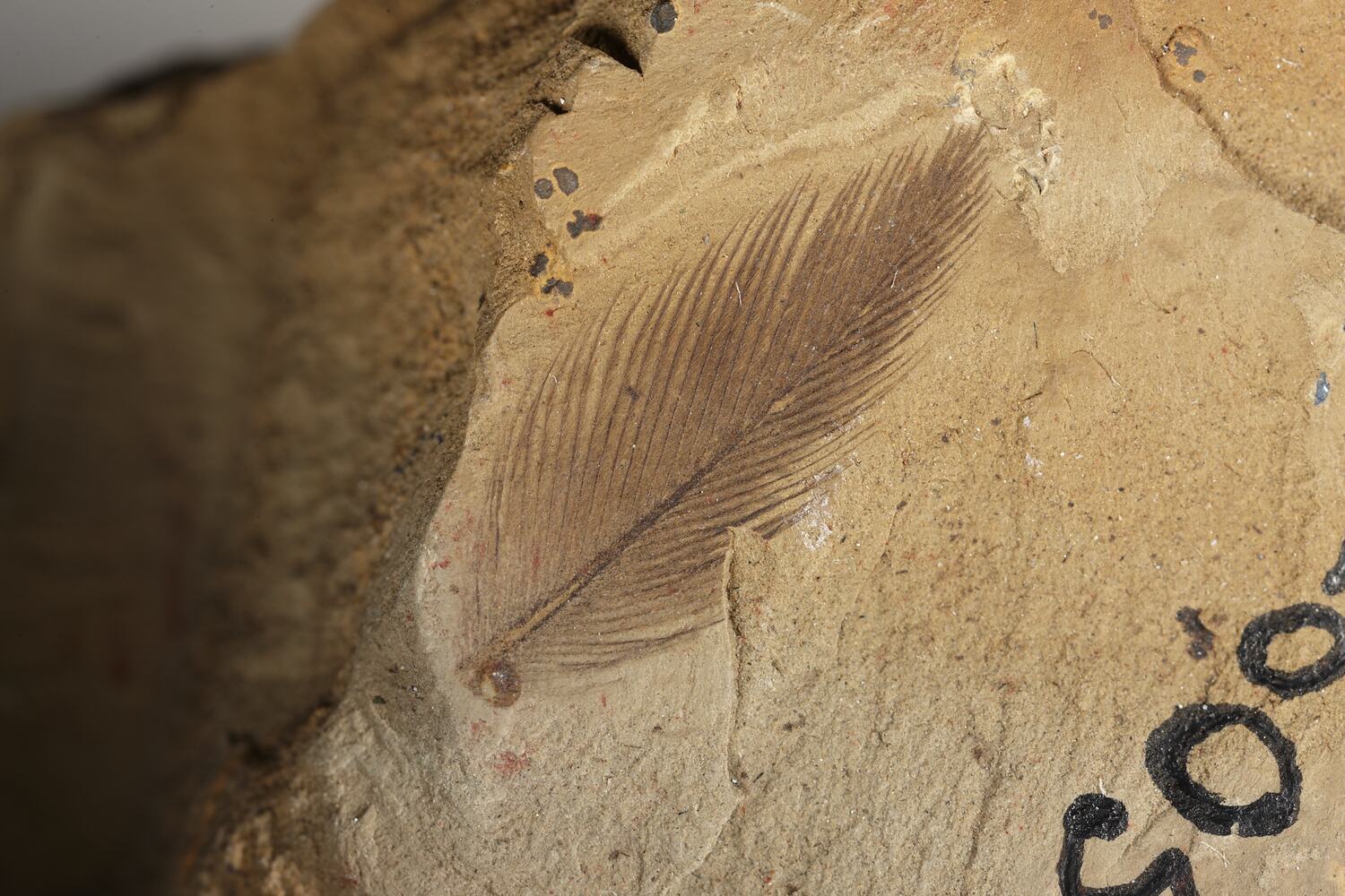 At Koonwarra, microscopic rod-like structures can be seen on several feathers. In some cases, they may in fact be fossilised bacteria on feather surfaces, which can have similar shapes to pigment molecules. Others seem more definitely embedded in the feather structure, and form bands of dark- and light-coloured vanes along the feather body.