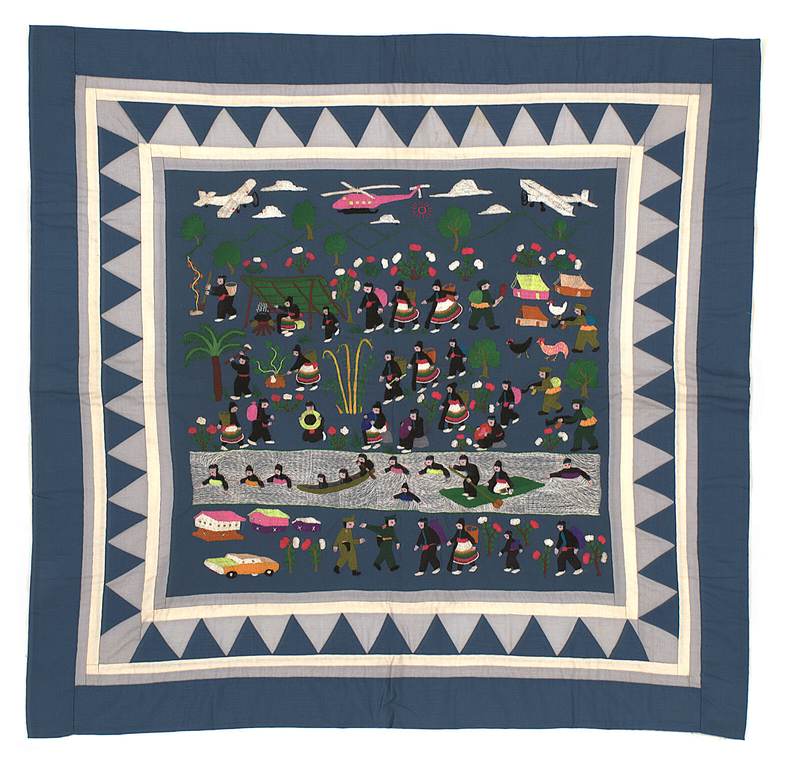 The Victorian Hmong community developed after many Hmong fled from Laos in 1975 and arrived in Australia in the mid-1980s after spending time in Thai refugee camps. Their embroidered works frequently tell traditional cultural stories, as well as document their migration journeys. These pictorial embroideries developed very recently in Hmong history, when Hmong men began to draw elements of traditional Hmong stories to help make sure they would be remembered during the times of change. Women began to have the men draw these pictures onto fabric so that they could stitch the stories on cloth. Fine needlework has always been a source of great pride to Hmong women and girls are taught to sew at age seven or eight. The work also include a variety of applique techniques, colours, stitches and designs.