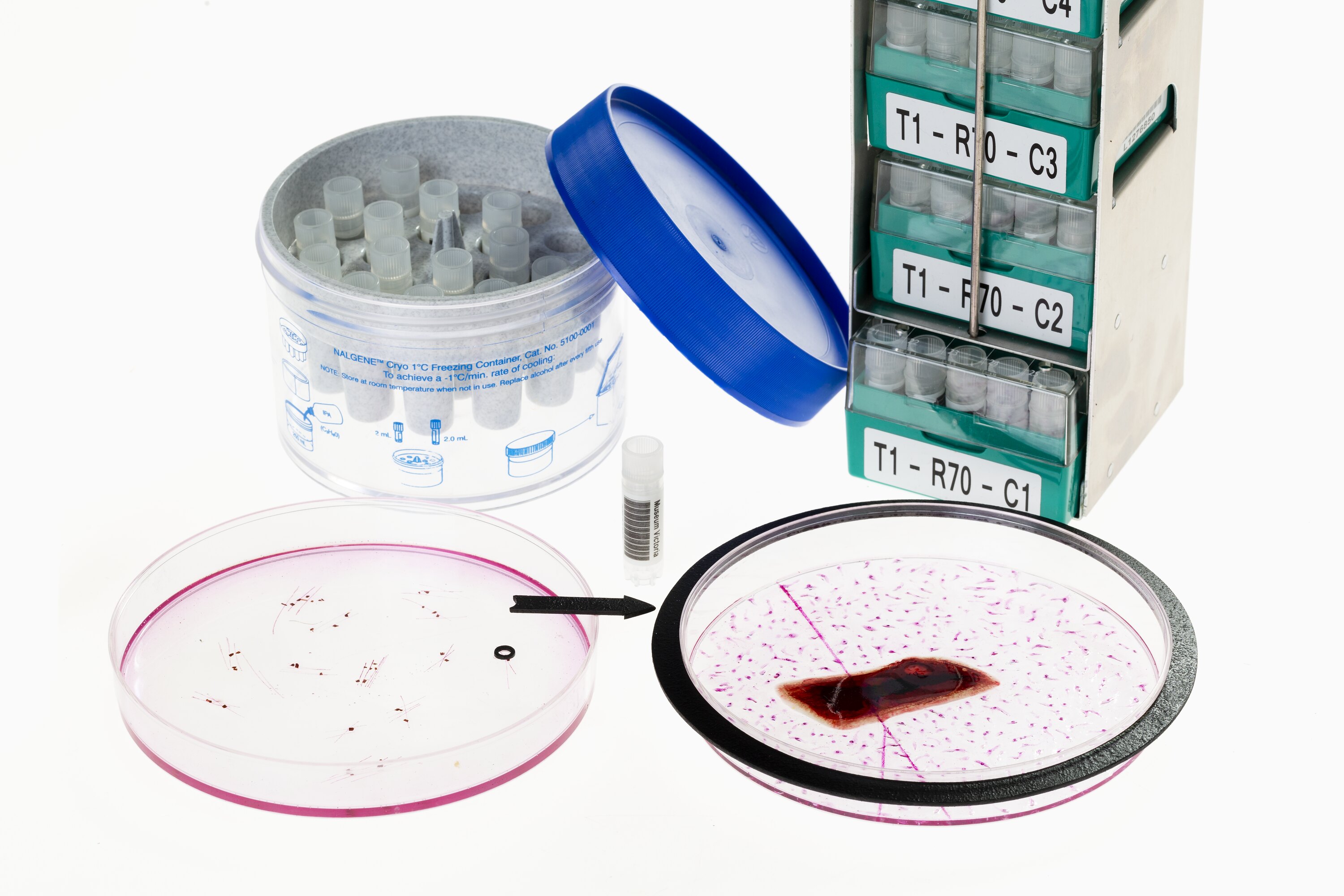 Skin samples are taken from a live animal and placed in a petri dish containing a cell growing medium. When kept in carefully-controlled conditions, the living cells multiply, and can be frozen for later use in the centuries to come.