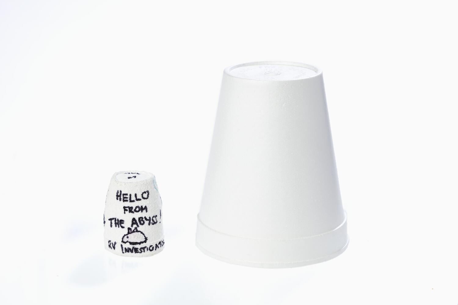 When a styrofoam cup travels with our probes down to the depths inhabited by abyssal creatures - 4000 metres this time - it returns to the surface shrunken and hard. At that depth, the pressure is 400 times atmospheric pressure at sea level. This enormous pressure squeezes the air out of the foam and shrinks the cup, helping to illustrate just how remarkable it is that animals can survive these intense environmental conditions.