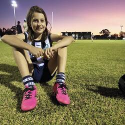 Layla and Michelle donated the banner to the Museum's AFLW collection in 2023 along with photographs documenting her playing career. A Pair of Pink Footy Boots: In 2025, Layla donated her pair of pink footy boots, the first boots she ever wore on a footy ground. Layla reflects: 'I don't really remember when we bought the boots, but my fondest memory of wearing these pink boots would have to be when I was selected to play an Auskick game at Marvel Stadium for my local club Lake Boga. We got to watch the Essendon vs Fremantle game for the first two quarters in the Grand stand and at half time made our way down to the change rooms.' 'We were playing for Essendon against another club dressed in Fremantle gear. I recall being very excited, especially because I got to play alongside my best mate Jack. That night, I also kicked a nice goal. I snapped it from the right point post and watched it eagerly, waiting to see if it would go in-between the goals. I remember being extremely overcome with joy, running around high-fiving my teammates.' 'When the ending halftime siren had gone we had to make our way quickly off the field. I saw the Essendon players but I didn't get to meet them. It was an amazing experience, one I could never forget. When I got home, I remembered that dad had told me to pick some grass from the ground of Marvel Stadium as a memento but I forgot to. So at home, I scraped all the grass off the bottom of my pink footy boots and put it into a container that I still have to this day. The grass has slowly turned into dirt by this point but it is still a great memory!' In 2025, Layla has been playing in the under 12's Lake Boga team; she also pulled on the Swan Hill Girl's footy jumper again, playing under 15's girls football in a four week mini competition which she loves. And Layla was selected in the Central Rivers under 15 girls Interleague team, playing against Sunraysia Football Netball League (Central Rivers is a combination of the Central Murray FNL and Golden Rivers FNL). So Layla's AFLW adventure continues strongly!