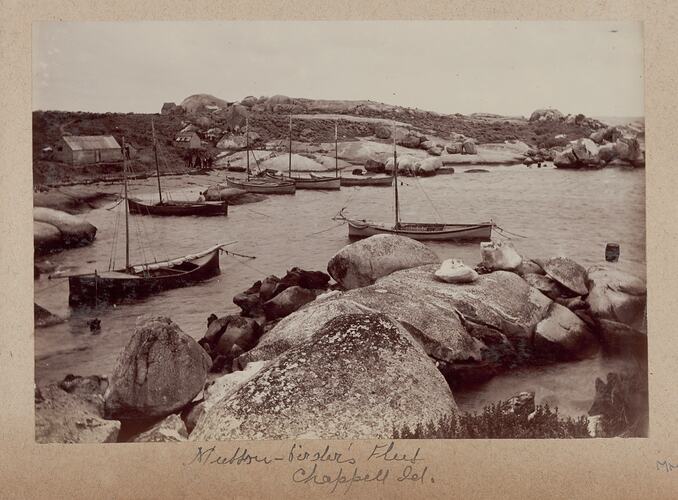 On the 26th November, leaving Sandford Bay or the Settlement, a decreasing wind affords an opportunity of beating across to Chappell Island, or Humpy as the islanders call it, to witness the mutton-bird egging operations. As before mentioned Chappell Island is at the entrance of Franklin Sound, about five miles out. The island is about two miles long by a breadth of a mile, is remarkable for the cone-shaped hill in the centre, rising to a height of 650ft. Chappell is par excellence: the mutton-bird rookery of the Straits, its whole surface under the tussock grass, salt bushes, large crops of nettles, gardens of yellow immortelles, &c., being completely honey-combed with the burrow-like nests of the sooty-plumaged birds. Thither the islanders repair twice a year - about a week towards the end of November for eggs, and again in the autumn to secure and preserve the young birds, which appear to be the staple food of the inhabitants, both white and dark. When we arrive egging is at its height. Our cutter is moored to granite boulders in a serene little cove on the east side, while we walk over to Shagboat Harbour on the south side, which accommodates the bird-eggers' fleet of seven double-ended boats. The men, women, and children (about forty) are ashore, some camped in sheds thatched with tussock-grass, some under the lee side of huge rocks with their boat sails converted into tents. We obtain novel and characteristic photographs of the boat harbour and fleet, groups of bird-eggers, and bird-eggers at work.