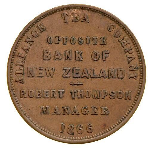 The Alliance Tea Company of Christchurch, New Zealand issued penny tokens in 1866. The tokens advertised their address as the corner of High and Hereford Streets, 'opposite the Bank of New Zealand', under the management of Robert Taylor. Researchers have suggested that this central position is evidence that the business was perhaps 'one of the earliest businesses in Christchurch,' (Canterbury, 1950). The token advertises a wide range of groceries for sale at the store, beyond just tea, including 'Italian Warehouse Fancy Goods...Coffees, Fruits and Spices.'