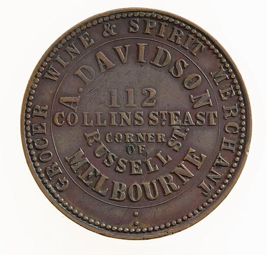 Davidson issued one penny token, struck by Thomas Stokes in 1862, bearing the details of his business on the obverse, combined with Stokes' stock Vine on the reverse.