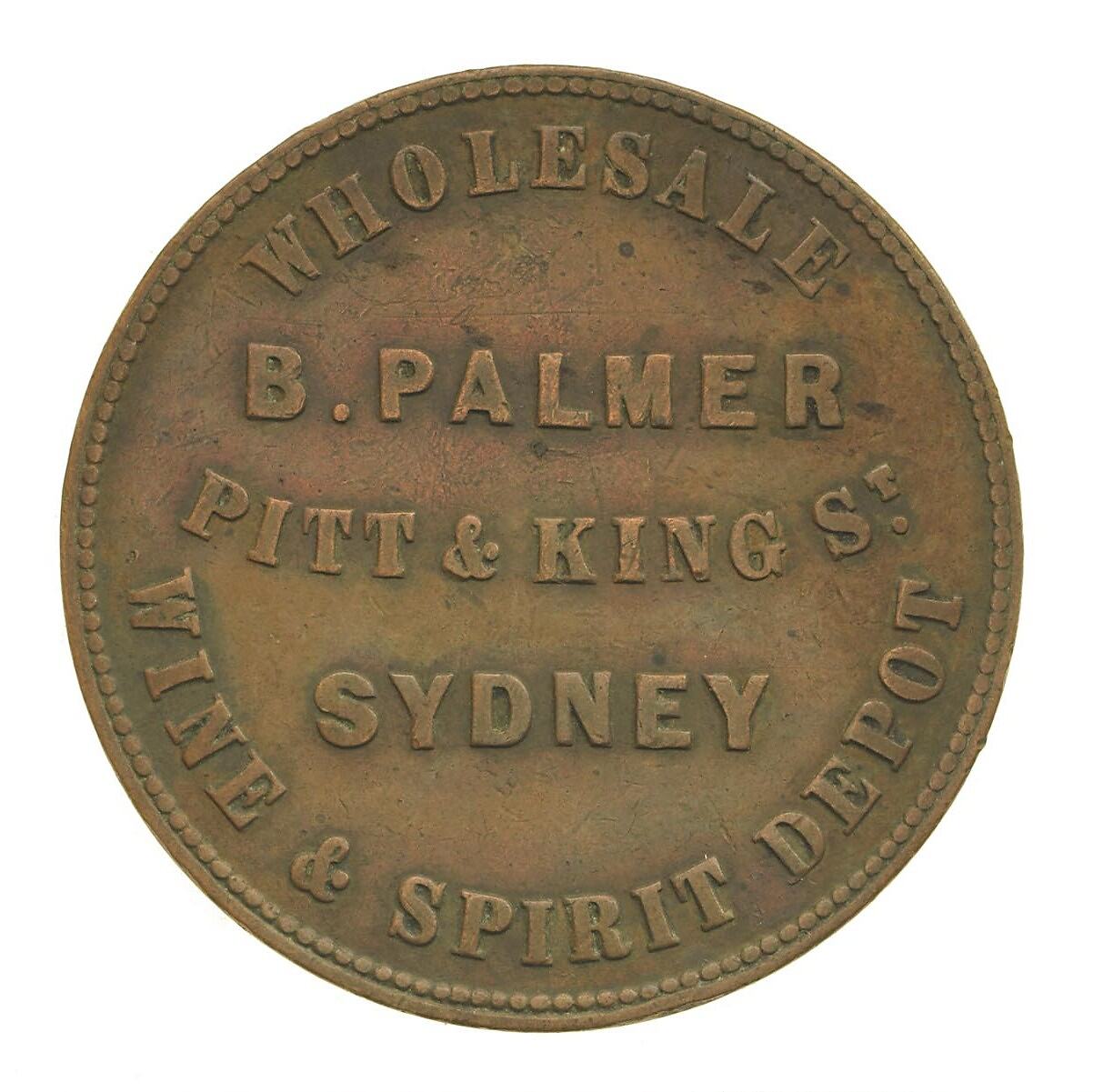 Benjamin Palmer is listed as the publican of the Liverpool Arms Hotel between 1855 and 1867. Sydney directories were surveyed between 1851 and 1870 for Museum Victoria's Trade Tokens Project. B. Palmer was first listed as a publican in Ford's 1851 Directory at 'The Swan with Two Necks Tavern' on the corner of Park and George Streets South. In 1855 he was listed as the publican of the Liverpool Arms, then located at 78 Pitt Street. He first appears at the address given on his tokens, the corner of Pitt and King Streets, in Sands' Sydney Directory for 1858.