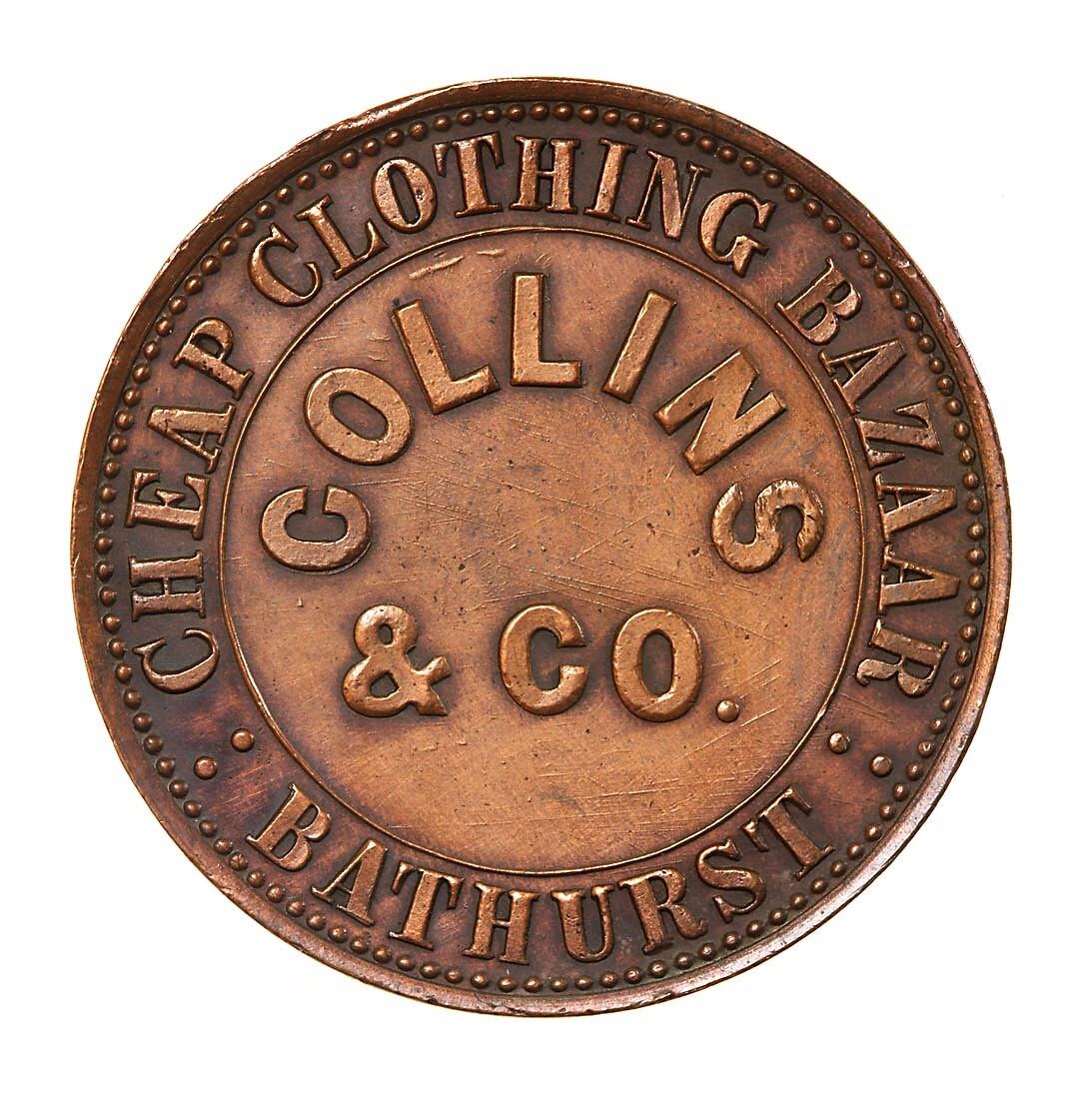 Aside from this advertisement, almost nothing has been discovered about this company during the 2005 survey of trade token issuing companies. Collins and Co. issued their penny token (struck by Thomas Stokes of Melbourne) in 1864. The business was not listed in the Bathurst Directory for 1862, so it is likely to have been established between 1862 and 1864. The only listing for a person by the name of Collins in Bathurst in Samson's National Directory of New South Wales for 1867 was for G.A. Collins of Morissett Street, suggesting that the firm had a brief existence, possibly of only 4 years.