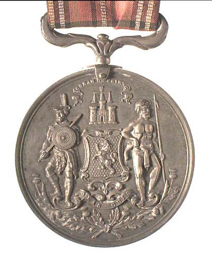 Museum Victoria holds a silver medal (NU 34518) that was awarded to the Secretary of the Scottish Comunn na Feinne Society of Geelong, Mr JS Mackay in 1877, in recognition of his services. The iconography of the medal is very interesting. The Society marks its Scottish-Australian identity by portraying a Scotsman alongside a traditional Aboriginal figure as supporters of its arms.