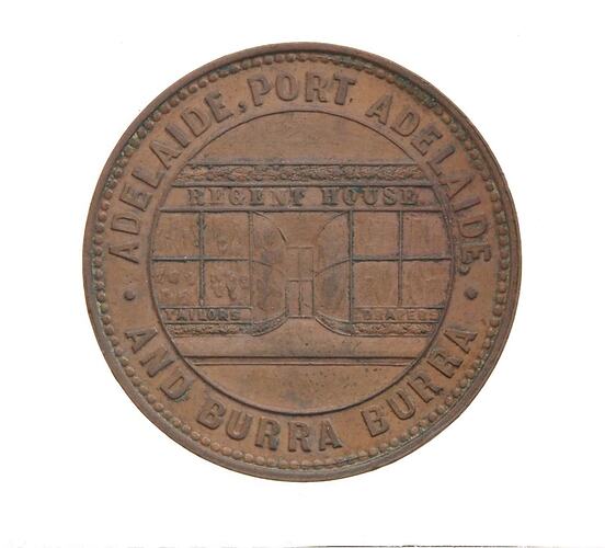 In Howell's Adelaide Directory for 1858, the same business addresses were listed, with the additional detail that the city store was at number 78 Hindley Street (Howell was also a token issuer. See records for Howell, John). The partnership must have been dissolved between the time Howell collected the listings for his directory and July of that year as during that month advertisements appeared in the Adelaide Advertiser informing the public that Crocker & Co. were 'SELLING OFF, SELLING OFF. - Crocker & Co. beg to inform the public of South Australia that they have determined on relinquishing the DRAPERY TRADE. In consequence of which they intend to SELL OFF the whole of their well-selected and extensive stock of Drapery Milinery Clothing Boots and Shoes &c. &c. &c. which will be sold to the public at a great sacrifice.' The sale was scheduled to start at 10 am on Thursday 22 July. The advertisement also included a notice that the shop, warehouse and dwelling were available to let. (Advertiser, 21 July 1858, p.1.)
