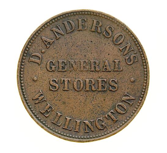 Anderson issued both penny and half penny tokens, struck for him by Heaton & Sons of Birmingham. The exact date of their issue is not known, but the Museum Victoria catalogue gives a date of circa 1858.
