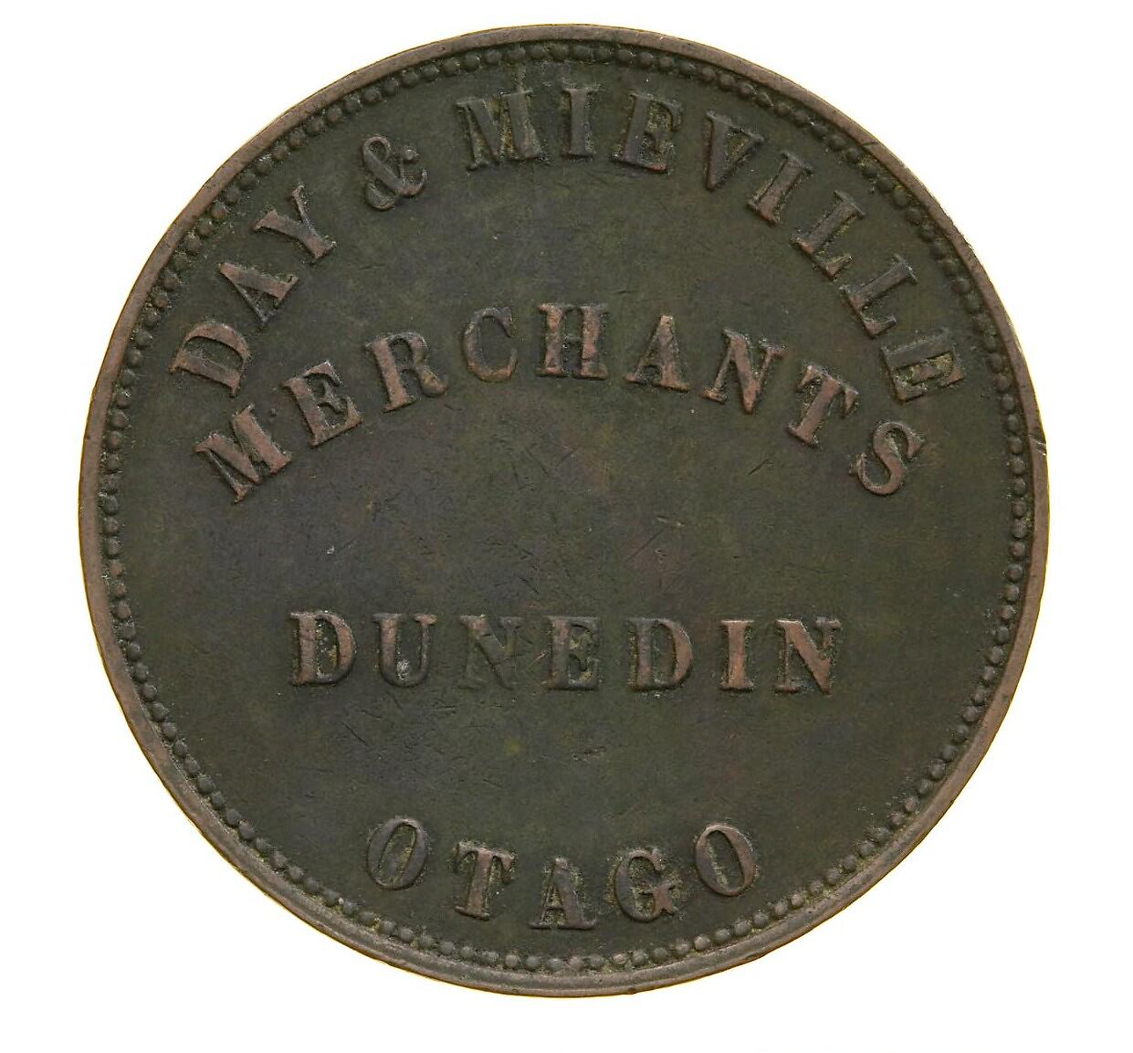 These two men were in business together from 1857, but their partnership dates from 1 November 1858, when Walter Day took Francis Louis Mieville into partnership in his hardware business. From 1851 Day had run a hardware business in Princes Street, Dunedin. It is not clear where their business was located, but it may well have also been in Princes Street. In addition to selling hardware, the partners were 'contractors, builders and storekeepers. Specialities were 'American cut nails' and 'Aberdeen Scythes''. The firm was licenced to sell powder, shot and firearms from 1861. Walter Day was appointed Sub-Treasurer and Accountant for the Province of Otago in 1862 and became Acting Provincial Treasurer. Mieville had been a sheep farmer in Mataura Mouth in 1853 and married the following year. By 1904 he was in London (Williams & Sutherland, 1950).