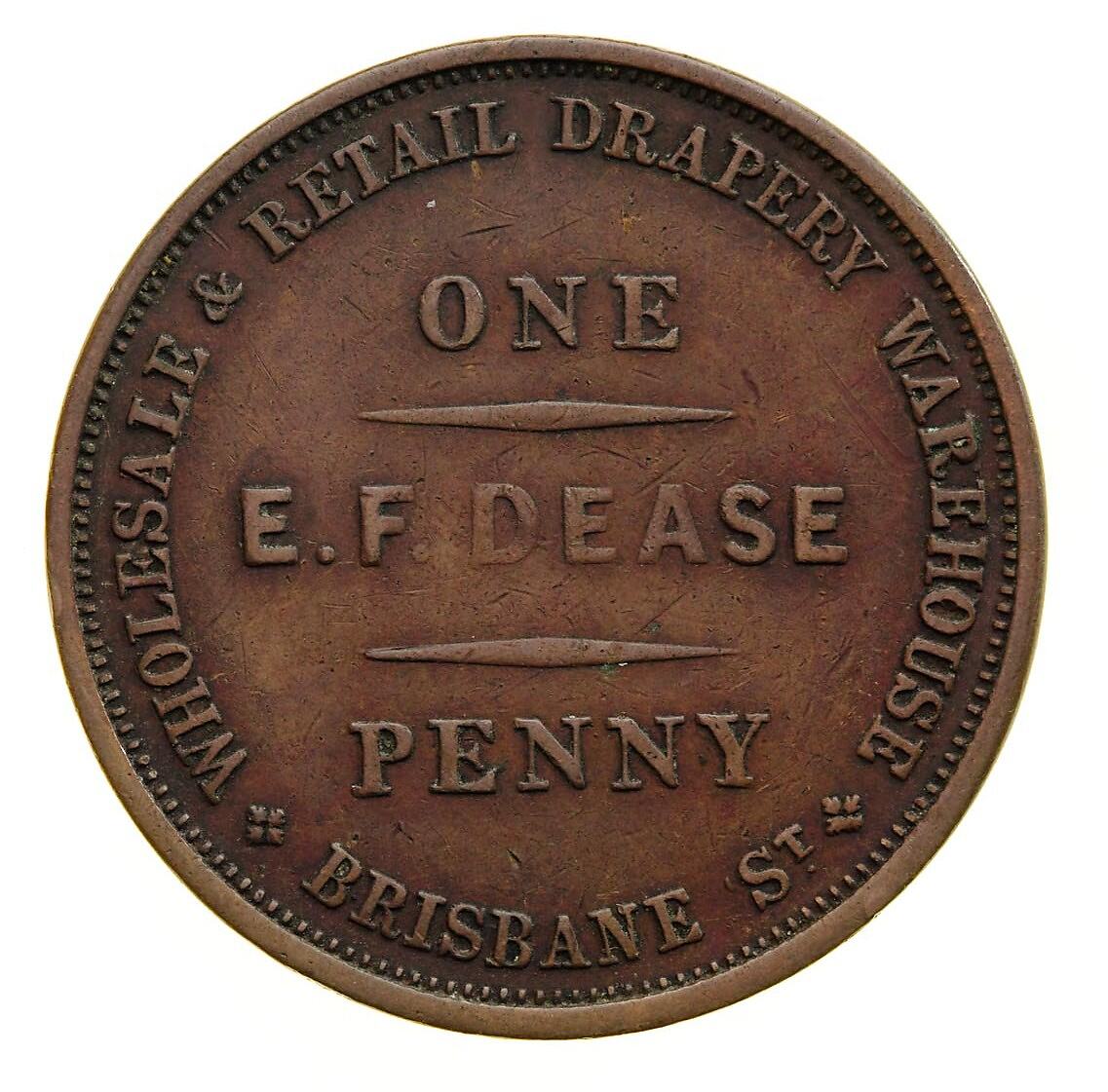 Edward Dease arrived in Tasmania in the early 1840s but little is known of his life there before he established his drapery store 'The Golden Fleece' in Brisbane Street, Launceston in 1851. He hung a golden fleece as the sign for his store. Dease issued a huge number of trade tokens. According to Roger McNeice in 1855 he imported 10,000 penny and halfpenny tokens, an event which made the local papers and must have had a big impact on the 'scarcity of small change' to which the Launceston Examiner referred in its article.