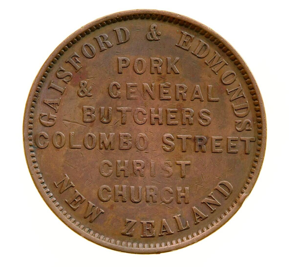 'In 1866 there were two butchers listed in the postal directory: William Gaisford, Sandyford Street, Sydenham, and G. Edmonds, 71 East Town Belt, Christchurch. The latter site was located on the corner of Fitzgerald Avenue and Tuam Street. It is possible that these were the partners in the Colombo Street business of an earlier date, but no proof has been secured to support this supposition.'
