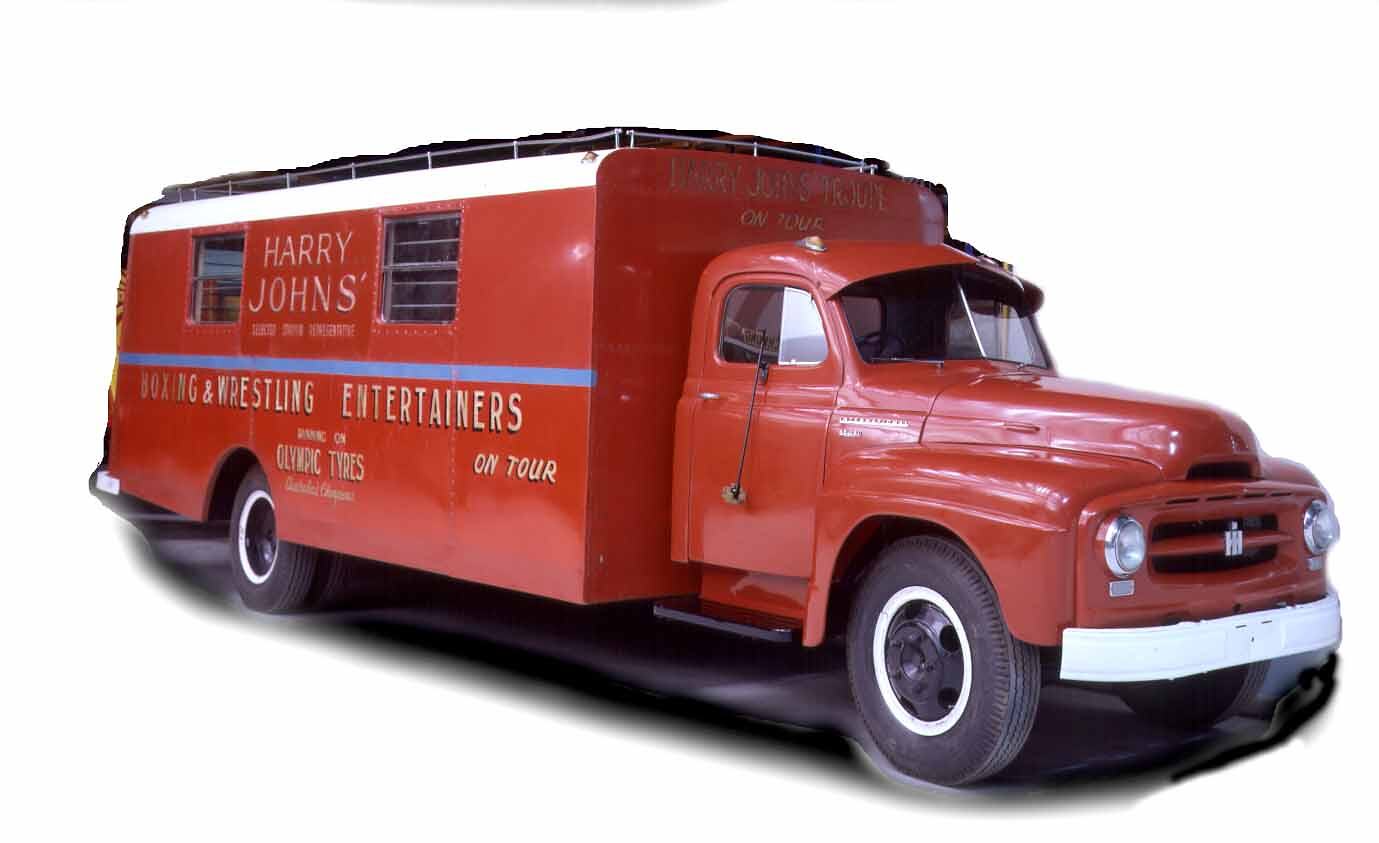 The Harry Johns Boxing Troupe Collection comprises 77 objects, including a tent, tressle tables, loud speakers, spotlight, tickets and clothing. The centrepiece of the collection is a red boxing truck. It reflects Harry Johns' lengthy involvement in the business: the cabin and chassis, from the International AR 160 Series, were purchased new by Johns around 1954; the rear section was grafted from his previous truck. Instead of relying on rail and local transport, Johns' troupe could travel direct from show to show, his truck a travelling advertisement carrying several tons of set-up equipment. This included the tent in which the boxing was staged; a drum and a sound system so that the spruiker Johns could drown out the showground competition; a 'line-up board' on which a dozen fighters would be paraded and matched with local hopefuls ('C'mon - who'll take a glove, who'll take a glove?'); and the general supplies of a life lived rough. On top of all this travelled the fighters themselves. Many were recruited along the way after showing promise against a Johns fighter. At least half of these fighters were Aboriginal men as tent boxing was one of the only ways a young man could break out from 'the Mission'.