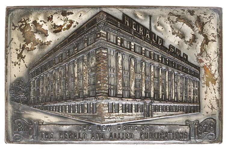 In 1928 the company opened a new building in Melbourne, which it celebrated with the issue of a medal (NU 33124). At that time the Herald and Allied Publications published the Herald, The Sun News- Pictorial, The Weekly Times, Sporting Globe, Table Talk, The Listner-In, The Home Beautiful, The Weekly Times Annual and Table Talk Annual.