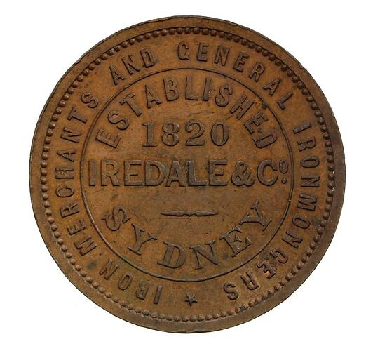 The company's first token issue dates to 1851, or soon after, which they employed the Birmingham firm Heaton & Sons to strike. This makes Iredale and Co. one of the earliest token-issuing businesses in Australia.