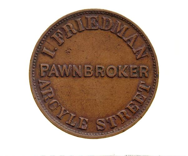 Further information about Friedman, along with his fellow token issuers, Abraham Lewis and Reuben Josephs, is found in A Few from Afar - Jewish Lives in Tasmania from 1804. Friedman was a significant person in the Hobart Jewish community from the 1840s. In 1842, he kept a public house where the meeting was held that led to the construction of the Hobart Synagogue. His name is recorded on a tablet inside the Synagogue as one of the members of the Hobart Hebrew Congregation's committee in 1843. The tablet commemorates the laying of the building's foundation stone. He is also listed as a contributor to the building fund for the Synagogue, as are Abrahams and Josephs. (Elias 2003, pp.30-31,33)