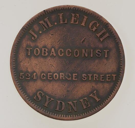 In December 1849 Leigh began trading as a tobacconist at 524 George Street East, Sydney. He moved to number 137 in 1854 and added wine retailing to his business. His tokens have the 524 address on them, so they must have been struck between 1851 and 1854. When the street was re-numbered in 1858 his address became 282/284 George Street, possibly indicating that Leigh had enlarged his store in the same year. Leigh's was still trading at the same address in 1861.