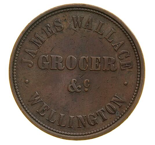 Wallace's tokens were issued in 1859, and they are the only tokens from Wellington to have the date of issue on them. The tokens were made for him in England by W.J. Taylor.