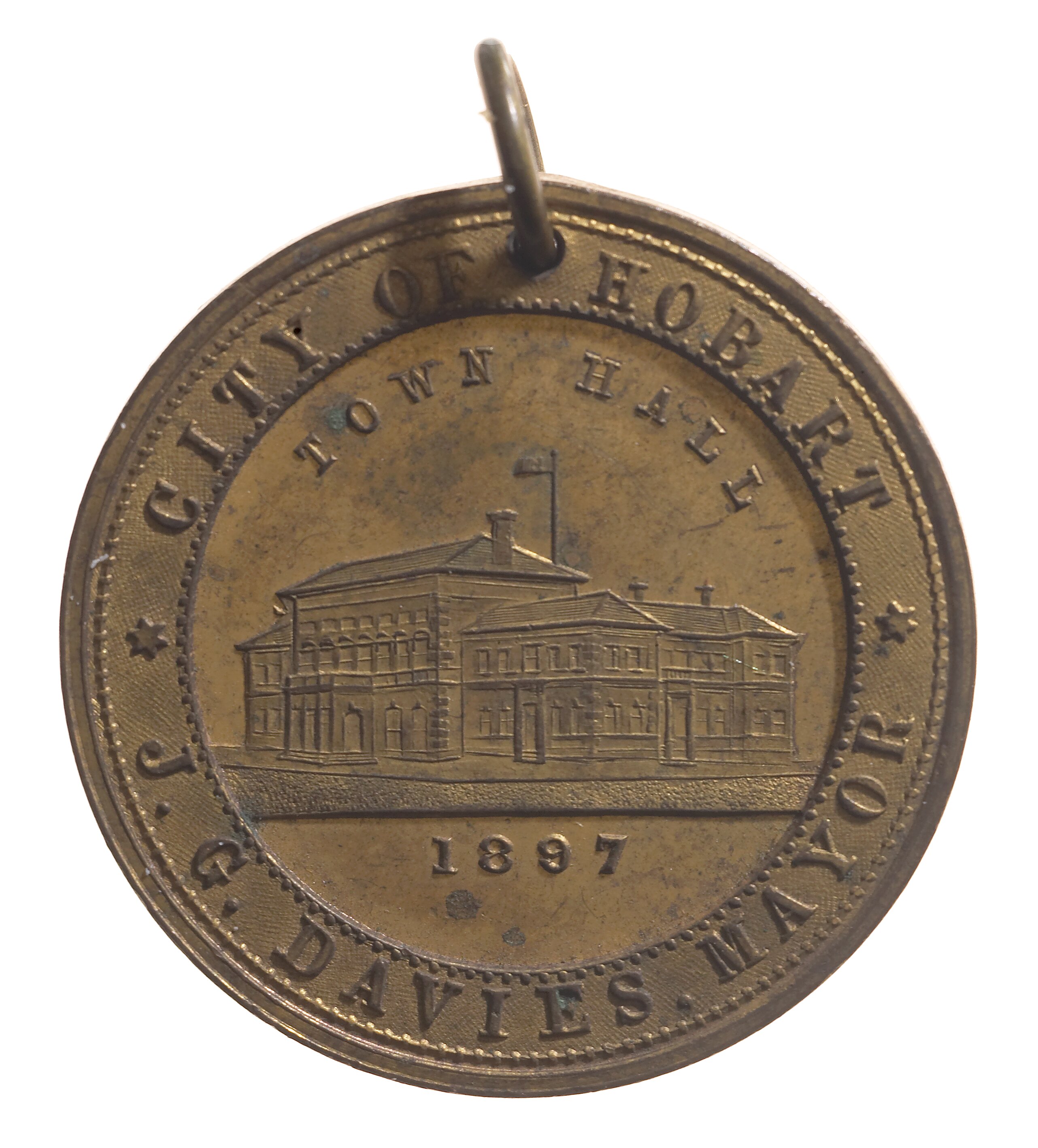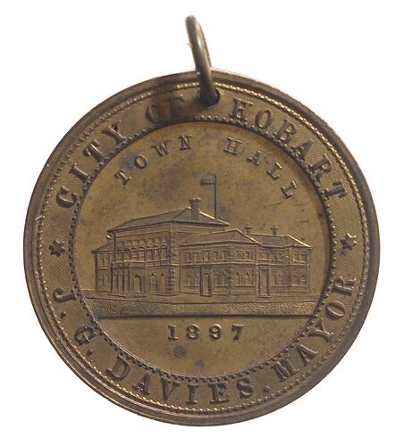 In 1884 Davies became an alderman in the Hobart City Council, and served six terms as mayor before his retirement in 1901. He was named as Mayor of Hobart on an 1897 medal issued to commemorate the diamond jubilee of Queen Victoria (NU 34783). In 1909 he was a successful candidate in the newly formed division of Denison. He was deeply conservative and a member of the Liberal Party, but chose not to enter government because of sensitivity to accusations of bias due to his newspaper interests. Davies was appointed CMG in 1901 and knighted in 1909. In spite of his Jewish ancestry, Davies was also active in the Freemasons, and was deputy grand master in 1896-1914 and past grand master in 1910.
